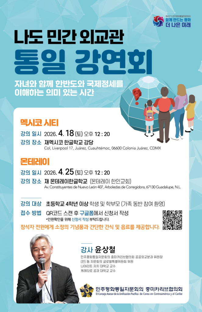 민주평화통일자문회의 중미카리브협의회에서 아래와 같이 통일 강연회를 개최하오니, 관심있는 분들의 많은 참여 바랍니다.