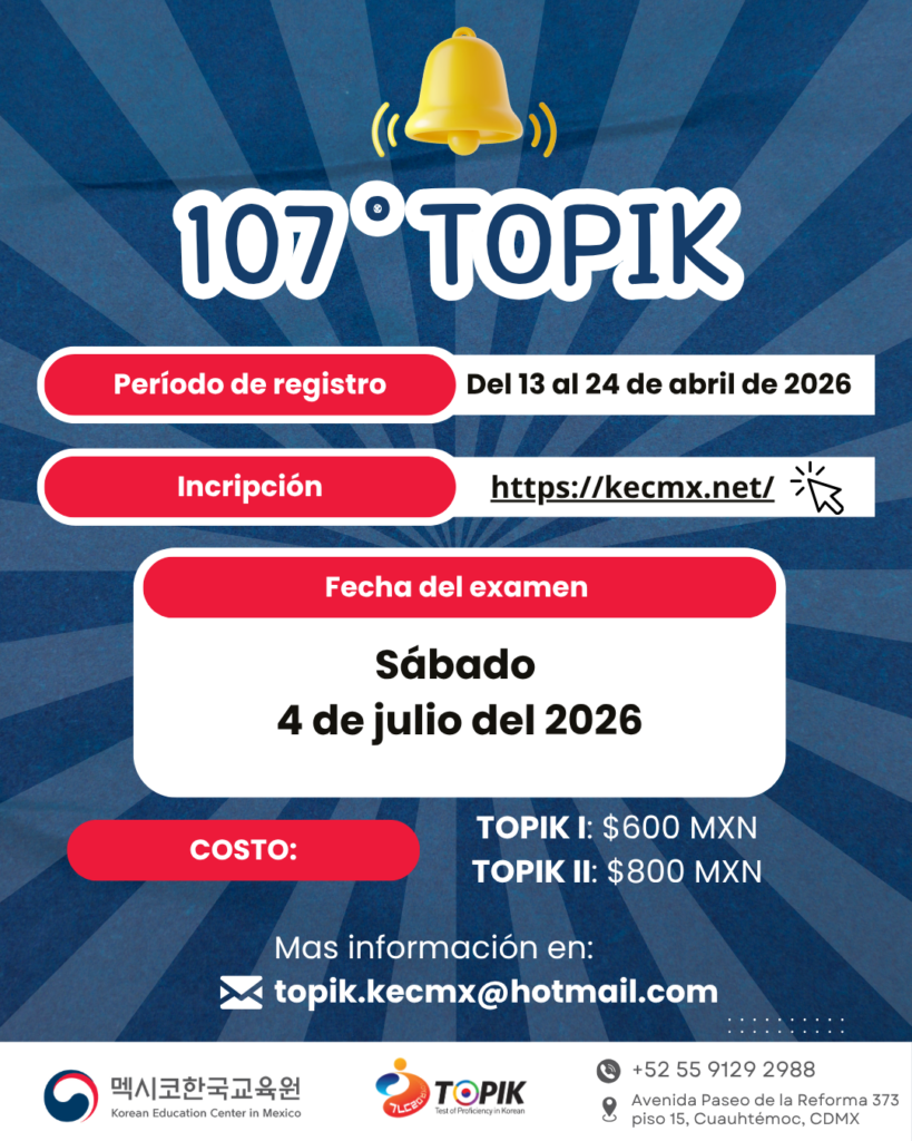 Para más información, favor de contactar al Centro de Educación Coreana en México al correo:topik.kecmx@hotmail.com o al número 55-9129-2988.